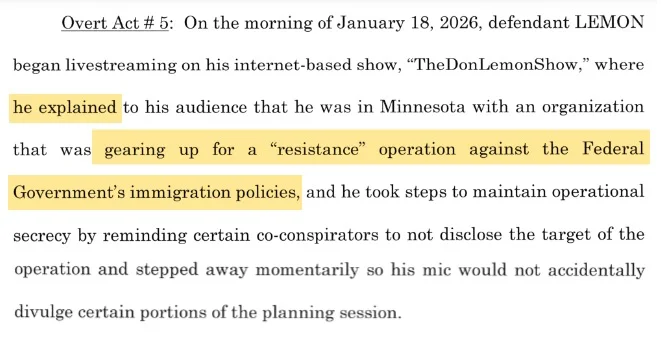 There are some paragraphs in the indictment that suggest more involvement than that of independent observer and journalist. For example, Lemon attending a meeting with organizers that were gearing up for a resistance operation against the government might be a problem. Maybe it doesn't matter.