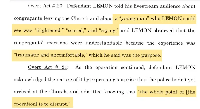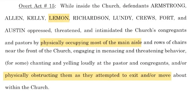 Don Lemon and the protesters allegedly engaged in intimidating behavior that obstructed church members from exiting, causing fear among children and congregants during the disruption. There is video evidence of that.