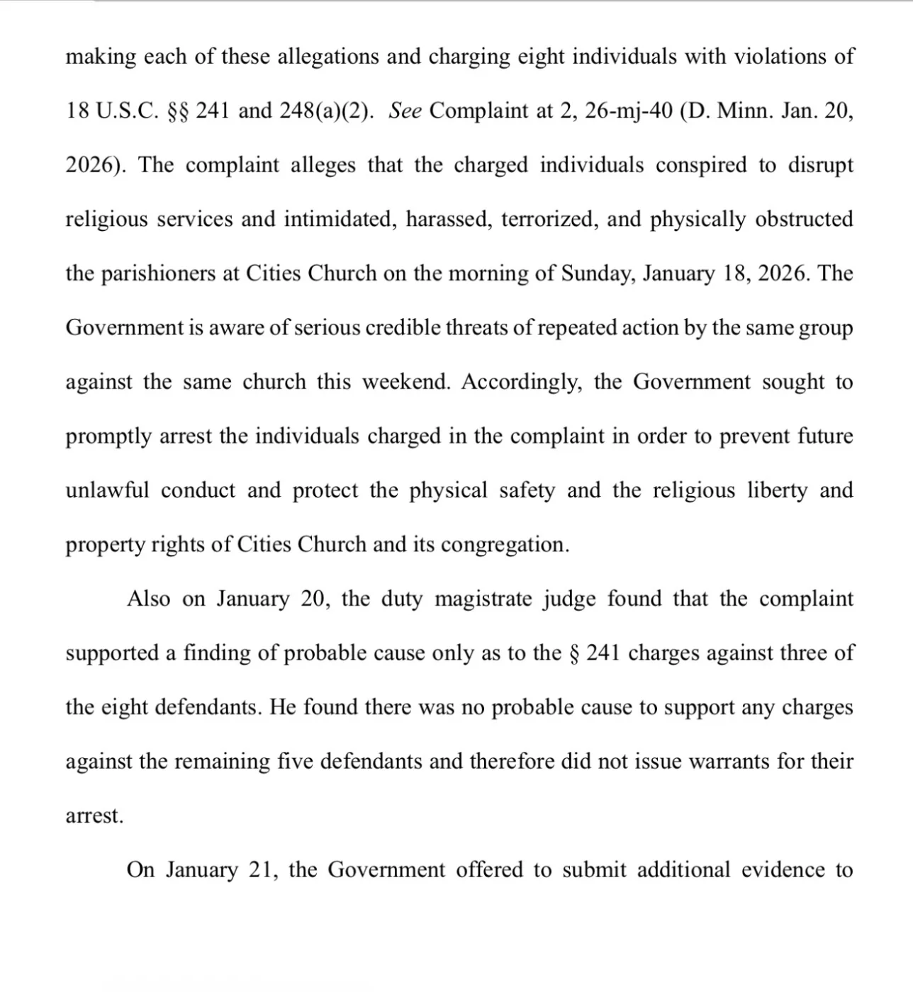 As a result, Claiming or citing the emergent need to have the arrest warrants expedited as well for the remaining 5 defendants due to risks that the defendants would target another church, Bondi petitioned the district judges to review and hopefully appeal the magistrate’s judge’s decision. However, Chief Judge Schiltz noted that neither he nor any judge in his jurisdiction or federal court have ever received such a request before DOJ nor thus questioned how to even approach and start such an appeal process. He and the other 2 chief judges from his district ultimately decided not to intervene or determine a decision in this case. Only one, Judge Grasz, communicated that he thought that had probable cause for all 5 warrants. Nonetheless, all three judges confirmed the Magistrate Judge’s original judgement.