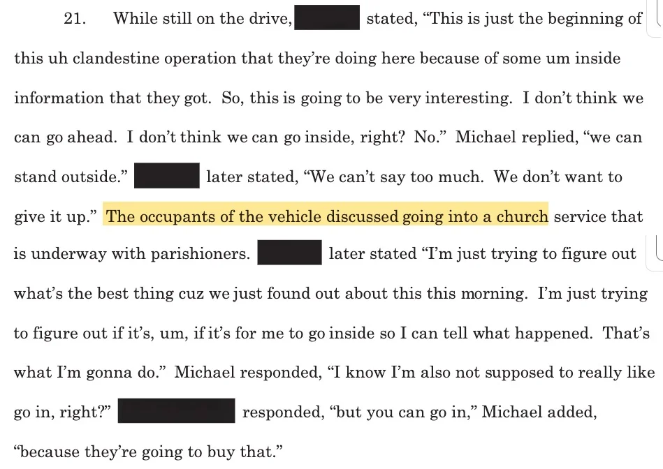 There's a strong emphasis on separating Don Lemon from the legal documents, and to interpret his role independent of protesters. He claims that he was in the church during the religious meeting for the purpose of telling a story - to report on the protest.They thought a coordinated invasion of the church, while engaging in acts of oppression, intimidation, threats, interference, and physical obstruction was a good idea. ( imo and from the indictment that includes Don Lemon).