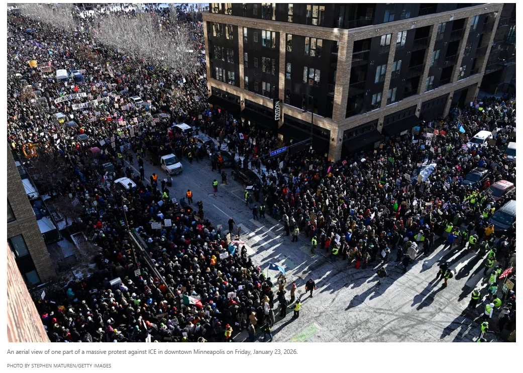Peaceful protest of thousands of Minnesotans on Friday with the message to ICE, "Get out." The following morning ICE agents shot a resident.