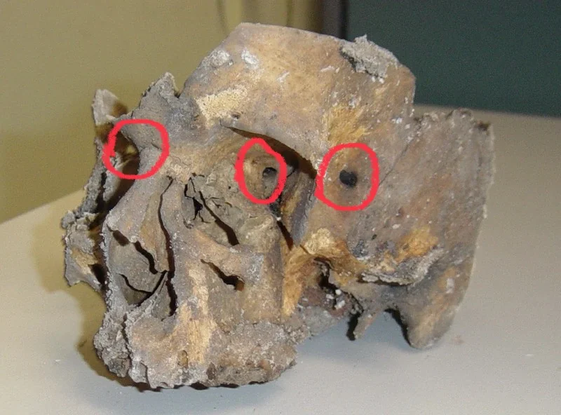 I noticed that there were three very round holes in the temporal bones of the skull that appeared to have been made by a continuous motion (something going in one end and out the other). I saw somebody on Facebook suggest that these could be bullet holes, but given this skull was probably an old medical specimen is it possible that it was made by some kind of surgical tool like a bone drill? Or is this just something that’s naturally there on all of our skulls and I’m just being really stupid? I know this isn’t where the openings for the ears are.