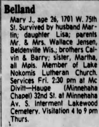 I think I found some new information on Mary from FindAGrave: Mary Jean Jensen Belland (1950-1977) - Find a...