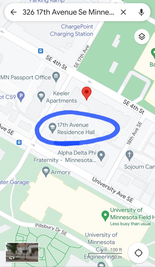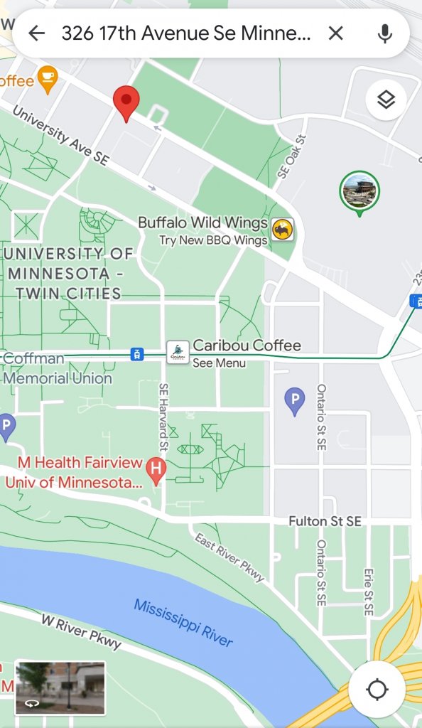 The Mississippi River is very close. I used Google maps to get directions to the resident hall (326 17th Avenue Se, Minneapolis) and it's marked by the red flag on my screenshots.I wonder if there’s any bodies of water close by? I tried looking on a map, but I’m terrible with maps.