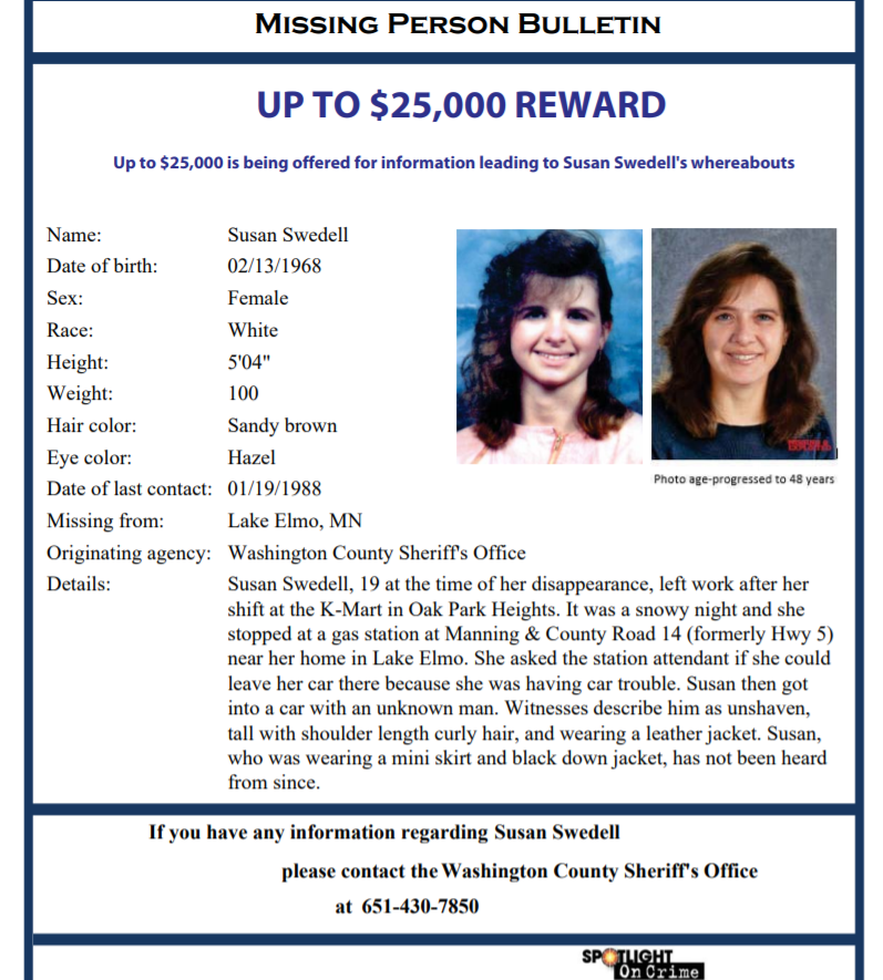 Is anyone actively looking into Susan's disappearance? Does anyone have any police information they can give me? I remember this happening and would like to help in the case. I was 15 at the time and she lived 45 minutes from me (less now with new Hwy's). It was about the same time that a guy showed up on the gravel road, outside our house, where I grew up. Scary things were happening in Minnesota at that time.