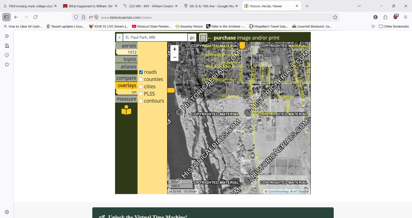 Here's a screen shot of a 1972 historic aerial map of the area where Bill was last seen. I wanted to see if the location of nearby water features were different from today. The neighborhood also looks pretty much the same.
