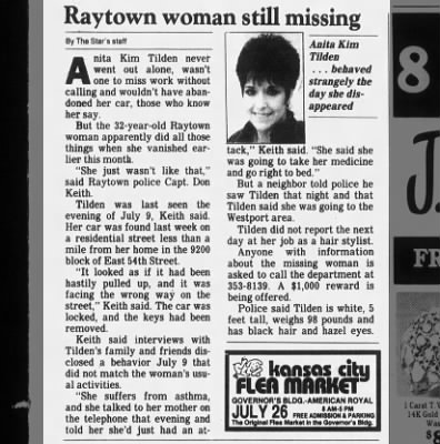 Tilden was last seen in Raytown, Missouri on July 9, 1987. She had called her mother the previous evening and said she wasn't feeling well because her allergies were acting up, and that she planned to go to bed early. She never arrived at work the next day and was reported missing.