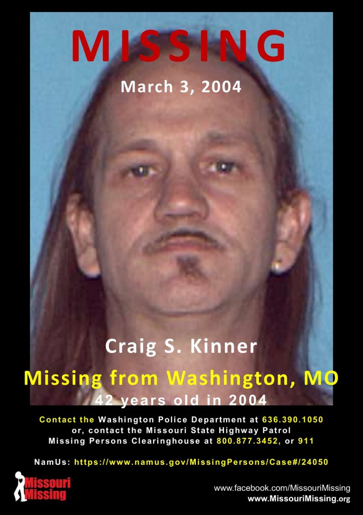 Kinner was last seen in the 700 block of Fremont Street in Washington, Missouri on March 3, 2004. He had left his mother's residence on foot around 11:00 pm after telling her he was going to go jump into the (Missouri) river. He called his wife and told her the same thing. Kinner left behind all his personal belongings and has never been heard from again. Few details are available in his case.