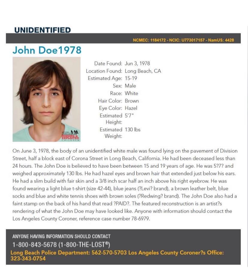 This might be a stretch, but i just saw a photo of a John Doe who was found on june 3rd 1978 in long beach, CA that looks very similar. The body was found a few years after Joggerst went missing, however its possible he stayed in California on his own terms and assumed a new identity. Maybe Geraldine knew he wanted to stay and thats why we don’t have a lot of info from her? Who knows, just a thought. I attached the file with an image of the John Doe and more info.