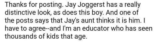 My younger sister knew Jay from elementary school on through high school. She didnt realize he was missing. Most probably assumed he ran away. It was a very large high school back then. His class probably had in excess of 600 to 700 students that year, maybe more.
