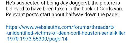 If that were Jay, I wonder how he would have met up with Dean Corll. I thought most of the victims came from the community around the candy factory. Were there other victims that Corll found elsewhere? It's been many years since I read the book and I don't exactly look forward to reading it again. :eek: