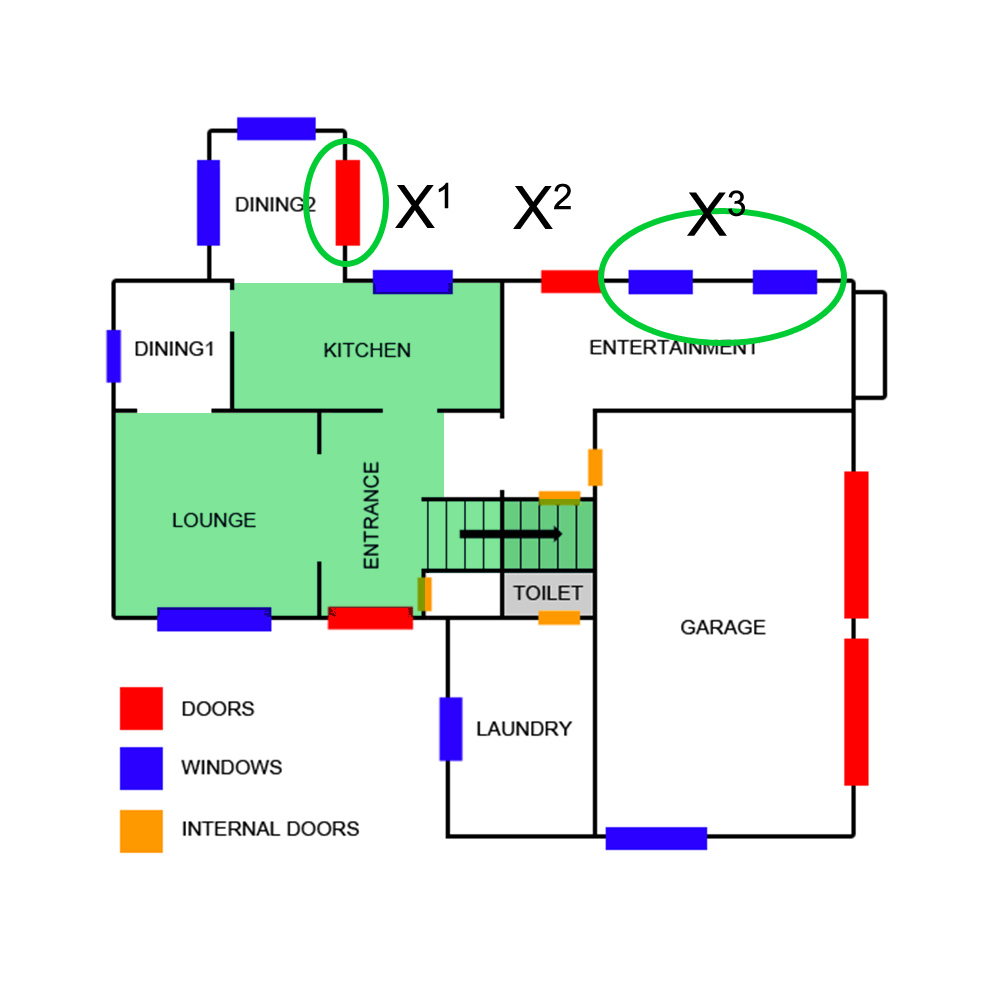 If JW spent most of the time sleeping on the couch or upstairs in his bed, and only came down to go in the kitchen, he might have only gone in the rooms marked in green: