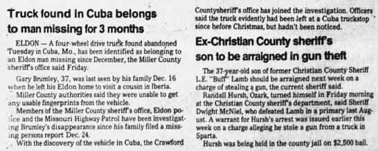 Circumstances - The missing person was last seen by his family at his home in Eldon. He planned to visit a cousin in Iberia, and left in a four-wheel drive truck. He has never been seen again, but the truck was located the following year at a truck stop in Cuba, Missouri. Authorities dusted the vehicle for fingerprints, but found none that were viable. Police stated that the truck had evidently been left at the location prior to the Christmas of 1984, but had not been noticed prior to the discovery in 1985. The circumstances under which the missing person disappeared remain unclear.