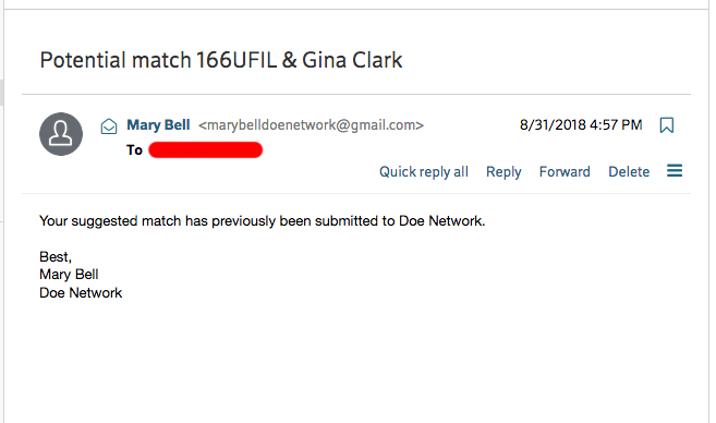 I follow the Jane Doe with Torticollis, you mentioned above. (NamUs #UP11091) I actually submitted Gina as a match to this specific Jane Doe to the Doe Network. Namus however, never put her down as an exclusion. Which I dont know why. But here is the email. Not sure if I should pester Namus with an email asking them whats up about that case. I dont wanna be a bother.