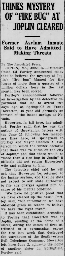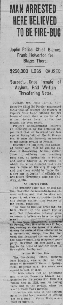 “Hawerton Likely to Return to State Insane Asylum: Assistant Prosecutor Asks For Mental Test Before Filing Complaint" --- Since his arrest as a child abductor early yesterday afternoon, Prak Hawerton, 52 - year - old Junk - dealer, alias John Stewart, has fallen into a coma in the city jail, which police and Assistant Harold Randall say necessitates a mental examination by the county physician. It is planned to take him to the county clinic this afternoon. After his arrest on East Walnut street yesterday afternoon with 9 - year - old Glenn Ramey, whom he lured away from a carnival to his ' filthy quarters in the basement of an abandoned shack at the rear of the Dysart stock farm a mile out of the city. Hawerton claimed to be "an escaped Inmate of the state insane asylum at Nevada. A telegram from that institution received by police this morning stated that 'he was released there. ' The message did not have the data of release. “Nickels Tempted Child” . . His arrest .climaxed a search by Detectives Lee Jones and Sidney Brookshlre, who were assigned to find young Ramey after his mother reported to police that her boy had not returned to their home since leaving for the carnival early Wednesday night. The day before, the wife of an employee of an automobile agency reported to police that Hawerton had given her small daughter a nickel at noon that day, with a promise of more money and toys if she would meet him after school that day and go to his home. The child refused the offer. “Detectives Find Mountain of Toys”. Hawerton and the Ramey youth spent the night in the basement of the hut, arose and ate a breakfast of stale bread, molded doughnuts and kraut, and were coming to town when officers, who were on their way to the shack, spotted them. Young Glenn Ramey, carrying a toy rifle Hawerton had given him, repeatedly denied that he had been abused. A search of the basement by the officers revealed small mountain of toys, supposedly collected by Hawerton during his trips up and down back alleys of the city looking for scraps of iron, old bottles and other articles collected by junk dealers. The junker told police he frequently has small boys and girls In his quarters as they remind him of his own children, whom, he said, were taken from him when he was sent to the asylum from Joplin several years ago. He become indignant at the thought of being under suspicion as a kidnaper