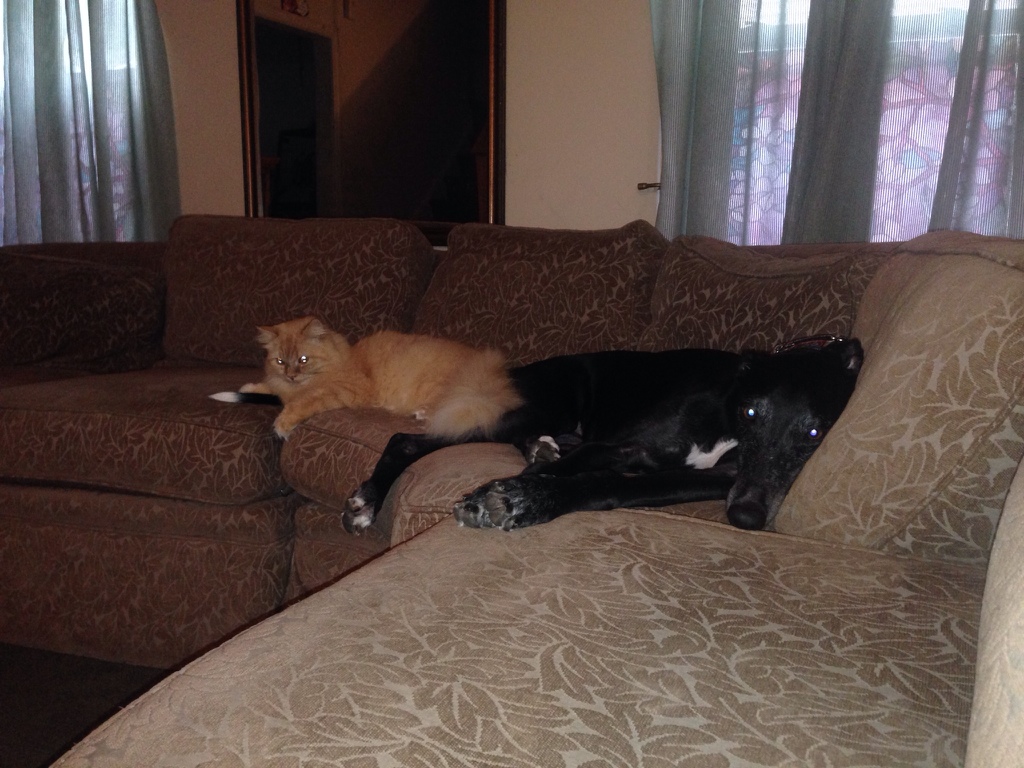 My house... It's the other way around....that cat will not give up the dogs tail...dog too scared to move.
