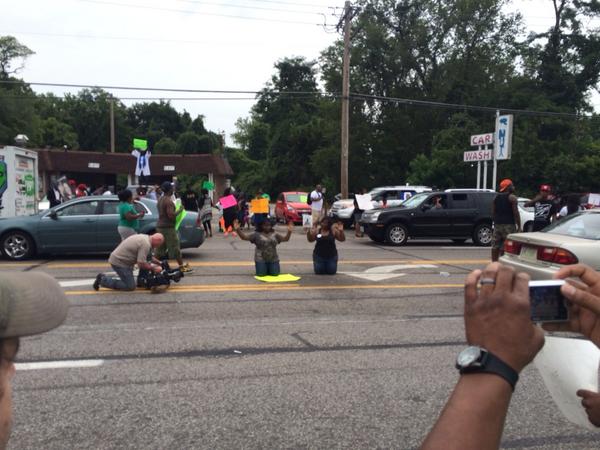 Get up off of your knees and try to retain a modicum of decency. Evidently some of the protesters really believe that a LEO shot and killed a man on his knees with his hands up. At least it's better than burning and rioting and throwing things.