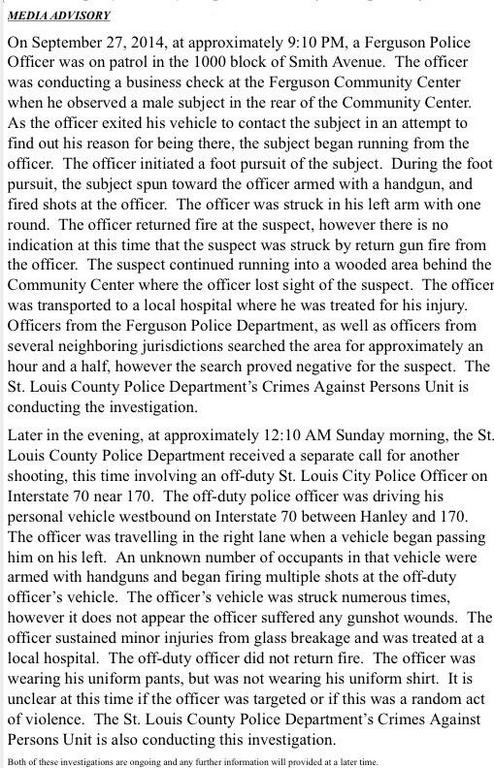 Ferguson officer shot in arm by burglary suspect. Another area cop injured by flying window glass after miscreants shot at him while he was driving home.
