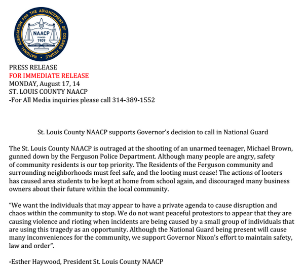 Official Release: St. Louis County @NAACP supports @GovJayNixon's decision to call in @NationalGuard. #Ferguson