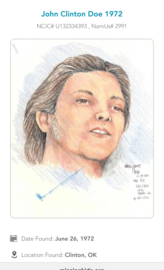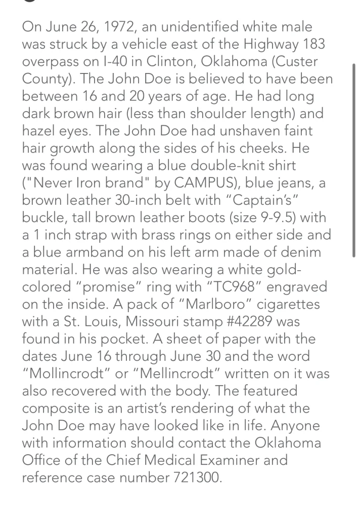 In May of 1971, a 15 year old boy named James Charles Stanford went missing out of Clinton, OK. A year later, in June of 1972, a man (in the same age range as Stanford,) was struck by a car in the same city. it is a far stretch, but I feel like the John Doe could potentially be the young boy. They are in the same age range, almost look alike (or at least would if the photo of Stanford was him after being missing for a year,) and overall is worth looking into. James Stanford didn’t really have much information about him on his missing poster, making it kind of difficult to know anything more about him or anything that would be able to identify him. all the information is on the national Center for missing and exploited children.