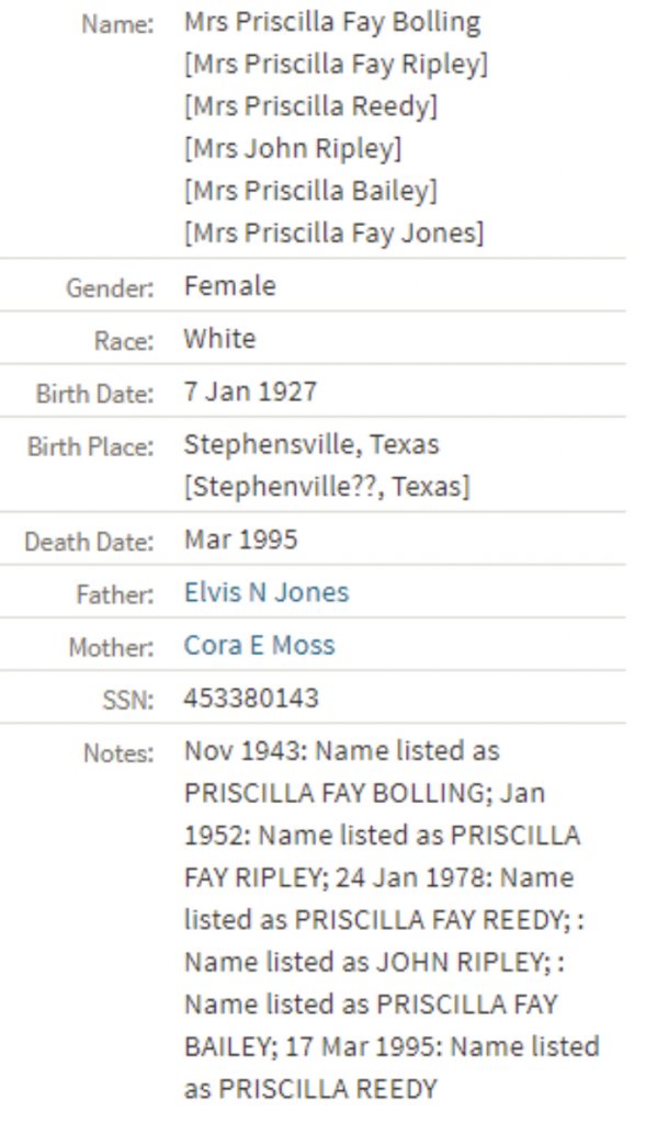 “Priscilla had several name changes. According to her index entry, Priscilla Fay Bolling registered for a social security card in November 1943, changed her name to Priscilla Fay Ripley in January 1952, and changed her name to Priscilla Fay Reedy on 24 January 1978. She was alternately known as Mrs. John Ripley and Mrs. Priscilla Bailey.