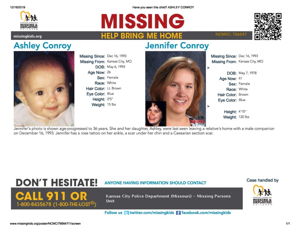Jennifer and her infant daughter, Ashley Conroy, were last seen in their hometown of Kansas City, Missouri on December 14, 1993. Jennifer and Ashley lived with Jennifer's grandmother in the 1000 block of Monroe at the time.