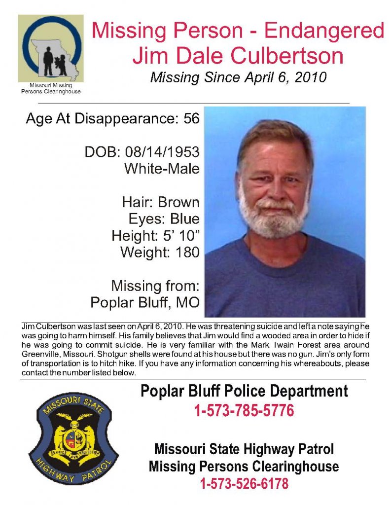 Culbertson was last seen in Poplar Bluff, Missouri on April 6, 2010. He left a note stating he was going to harm himself and has never been heard from again. Shotgun shells were found at his residence but his gun was missing. Culbertson was familiar with the Mark Twain Forest near Greenville, Missouri, and his family believes he would have gone to a wooded area if he was suicidal. At the time of his disappearance, Culbertson had no form of transportation and hitchhiked to get around. His whereabouts remain unknown.