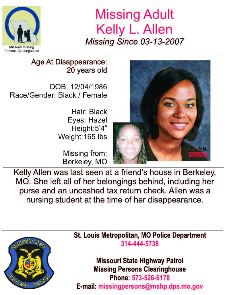 She was working at a nursing home at the time, and was looking for another job. Her mother last spoke with her daughter a few days earlier. She waited two days to report the disappearance to Berkeley police. She later filed a missing person report with St. Louis police. Police believe foul play may be connected to Allen's disappearance. An income tax refund check for more than $2,000 has not been cashed and she left behind all her belongings.