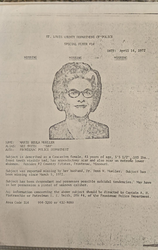 Subject was reported missing by her husband, Dr. Donn W. Mueller. Subject has been missing since March 5, 1972.