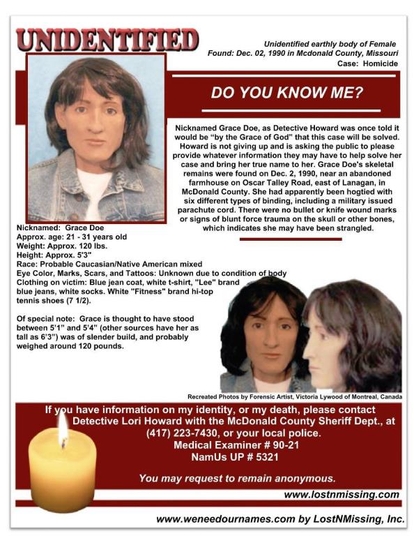 I think Grace Doe is a missing woman named Kelly Diane Sims. Kelly was last seen on October 16, 1990, before Grace Doe's supposed death. Both women were believed to have been abducted. Both women also had brown hair, Kelly was 5'4 at her disappearance, and Grace Doe was between 5'1 - 5'4. Kelly also weighed 120 lbs, and Grace Doe was approximately 120 lbs.