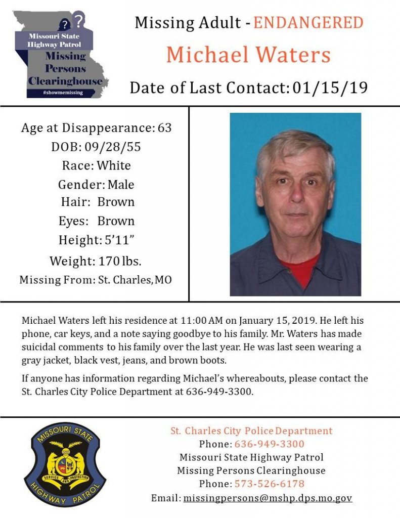 Michael Wayne Waters was last seen at 11:00 a.m. on Tuesday, January 15 at his home in the 900 block of Broadmoor Ln, St. Charles, MO. Waters left his phone, car keys and a note saying goodbye to his family. Waters was last seen wearing a grey jacket, black vest, jeans and brown boots.