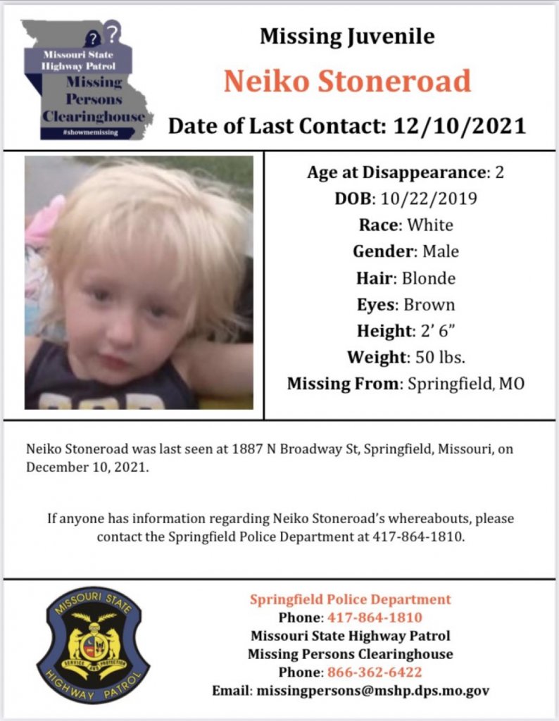 The MSHP tweet says anyone with information about Neiko Stoneroad should call Springfield Police at (417) 864-1810.