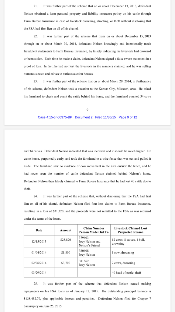 “21. It was further part of the scheme that on or about December 13, 2013, defendant Nelson obtained a farm personal property and liability insurance policy on his cattle through Farm Bureau Insurance in case of livestock drowning, shooting, or theft without disclosing that the FSA had first lien on all of his chattel.