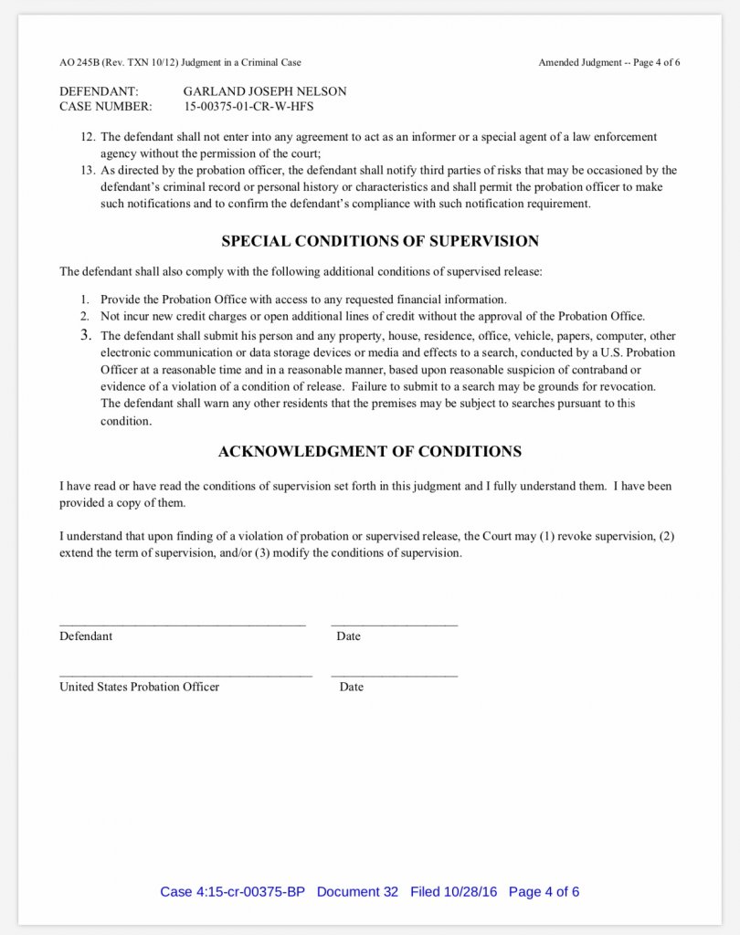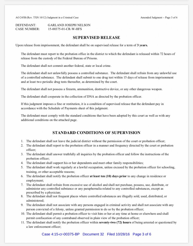 According to court records, the judge in the federal case ordered that Nelson be placed on supervised release for three years upon release from prison. He has been out for a year and three months, so the conditions of supervision still apply, IMO.