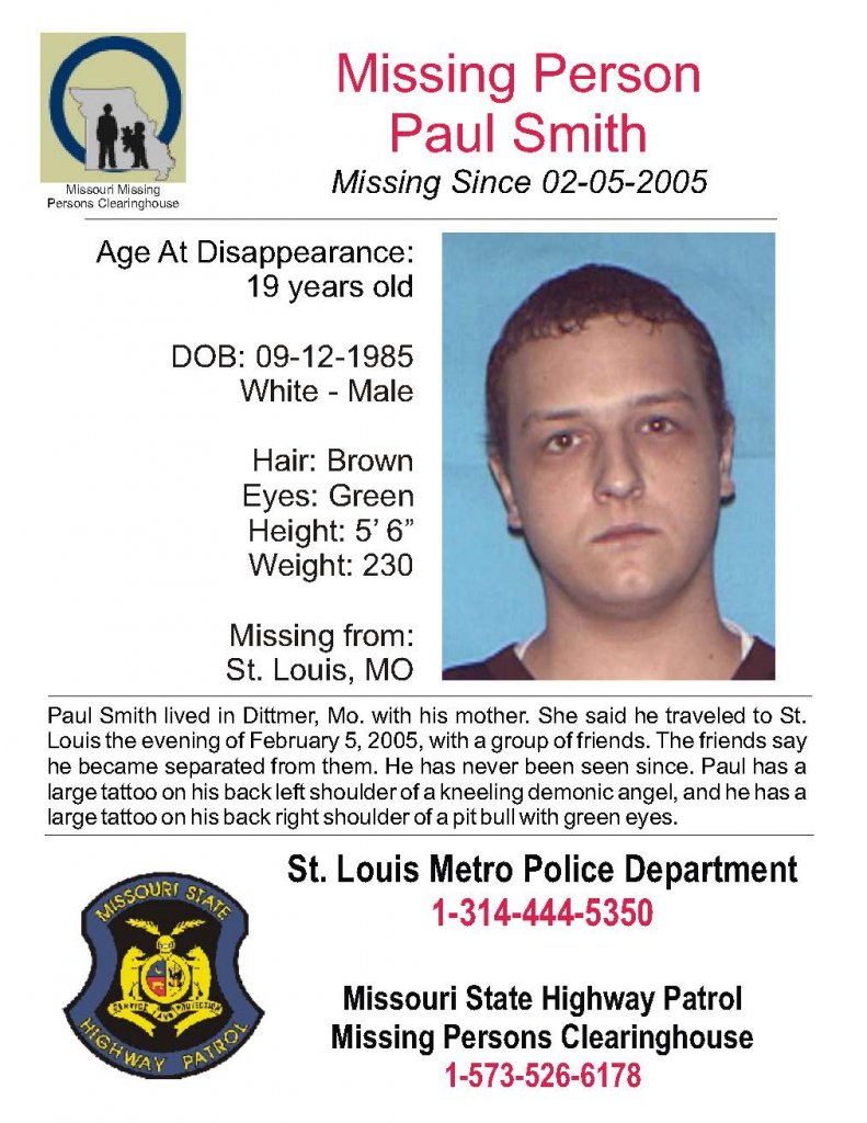 Smith was last seen in St. Louis, Missouri on February 5, 2005. At the time of his disappearance, he was living with his mother in Dittmer, Missouri. Smith informed her that he and some friends were going to St. Louis that evening, approximately 40 miles away. He never returned home and has never been heard from again. Smith's friends stated he became separated from them while they were in St. Louis and haven't seen him since. Few details are available in his case. His whereabouts remain unknown.