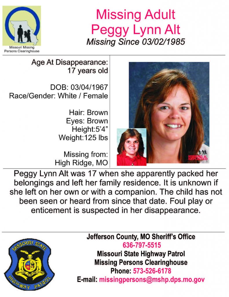 Peggy was last seen in High Ridge, Missouri on March 2, 1985, two days before her eighteenth birthday. She packed her belongings, left her family's home and never returned. It's unclear whether she left alone or with someone else. She has never been heard from again.