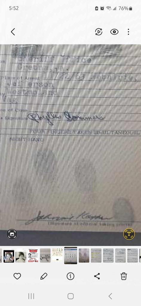 (((I 100% know she took a bus and went to Louisiana. I've also found out since the podcast that she was arrested in January 2025 for vagrancy and she used to Alias name Phyllis Sommers, but signed it over the top of the name Phyllis Corbin. Her mind wanted her to write her real name and she had to alter it it's very legible that it's altered.)))