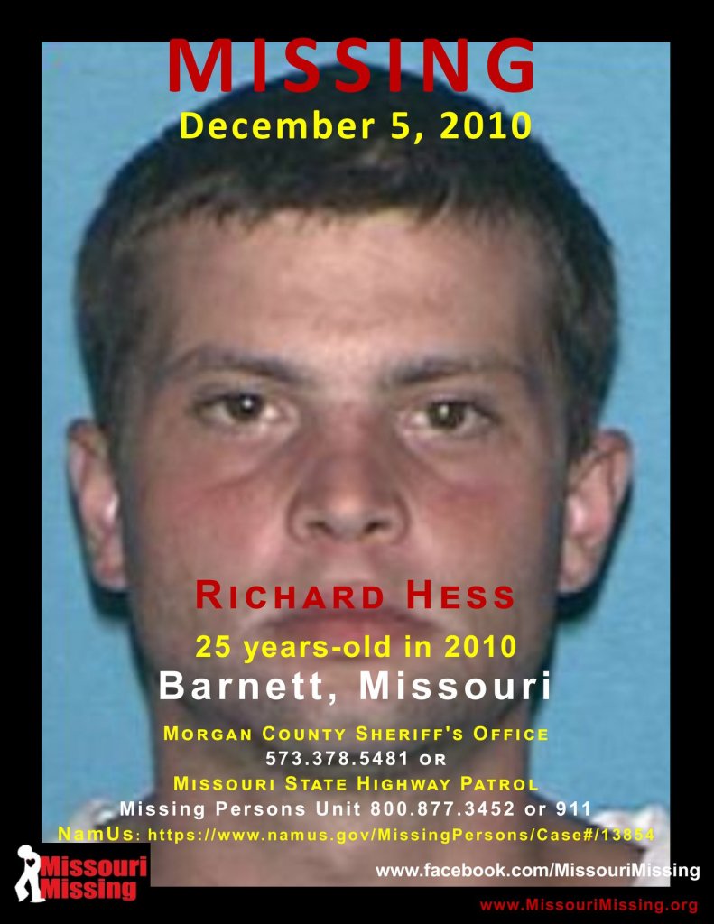 Richard Hess, 25, has been missing since December 5th, 2010 from Barnett, Missouri. Officially, the circumstances seem to remain unclear around his disappearance. The Find Richard Hess Facebook page has some very interesting information on the circumstances around his disappearance. Hess is a white male that is 5' 10', he weighs 155 lbs with short brown hair and brown eyes.