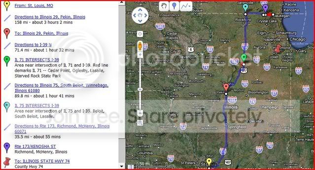 I started my map from St. Louis to Hwy 29 at Pekin. From there I proceeded north on I-39. On the way to Rte 173/Kenosha St, I-39/US 51 crosses IL 71 and IL 75. There's a county road 74 near Joliet, but no state 74. In that case, 74 might mean I-74. Anyway, take a look at the map. I haven't finished attempting to track the miles from (pte 2 pte) as indicated by RM, but the total route is 355 miles. RM notes what looks like 356 le.