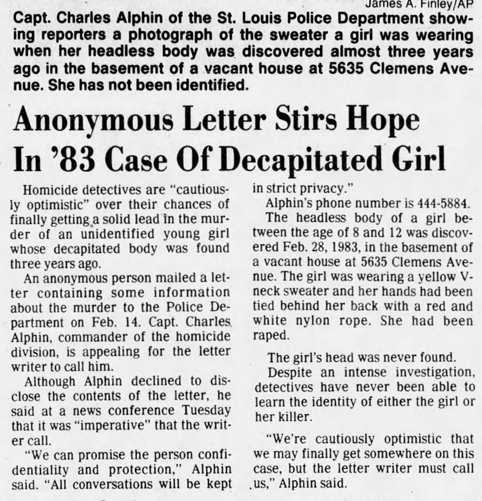 Feb. 28, 1983, two men looking for scrap metal to fix their car lit a cigarette in the basement of an abandoned apartment building on Clemens Avenue. The light illuminated the body of a young decapitated girl.