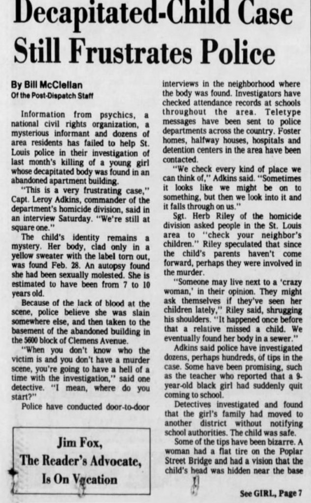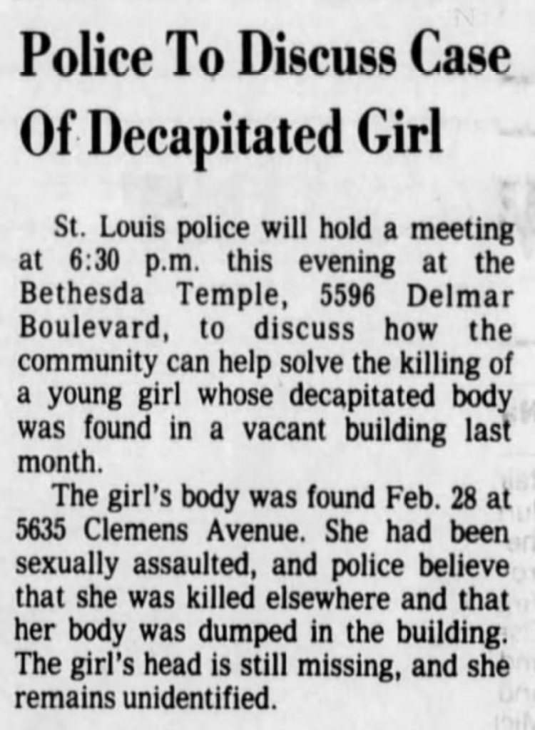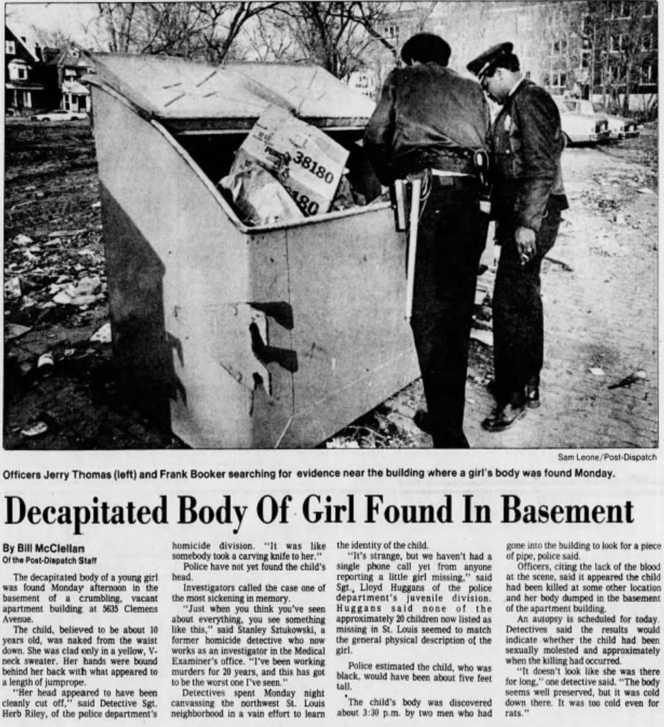 I can’t think of any other decapitated and sexually assaulted “unidentified girl around 8-10 years old who was found in the basement of an abandoned building in the 5600 block of Clemens Avenue”, in St. Louis, MO in 1983. He lived in the during the time and confessed to, and was most likely responsible for, the brutal murders of Colleen and Tiffany Gill in July of 1983.