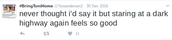 Toni tweeted "OMG just just pulled over again," and then just disappeared. Isn't that cause for concern? Her friends were very concerned very early on. The early gofundme just isn't an issue. It's a bit of a peeve of mine how people always obsess about the gofundme in these cases.