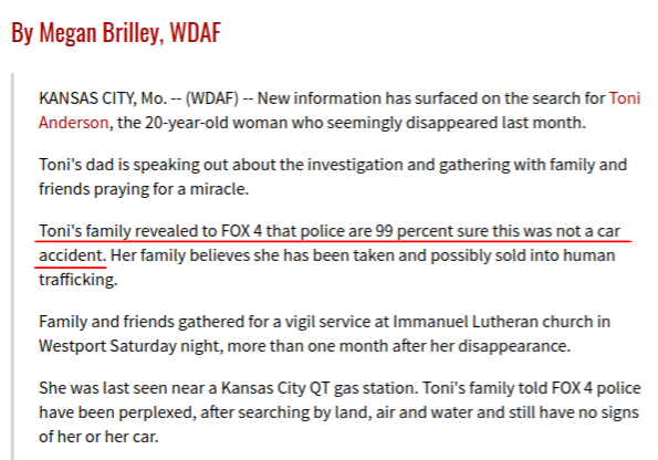 Hi, All. I've been following this discussion since it started, but am posting for the first time tonight. I just found this new (March 3) article and video interviewing Toni's dad's on his local news station in northern Minnesota, and it has some info (once again) that contradicts the "she definitely had a car wreck" theory: http://www.wdio.com/news/northland-father-missing-daughter-kansas-city-/4415057/
