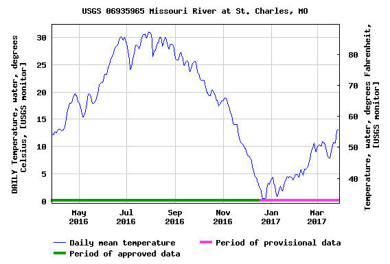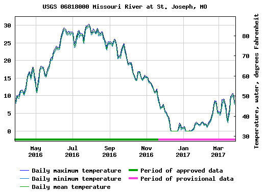 I know. Unfortunately they don't seem to have data for Kansas city. The previous graph is quite a ways downstream. The water only gets warmer as it flows downstream. Here is quite a ways upstream. Even colder.