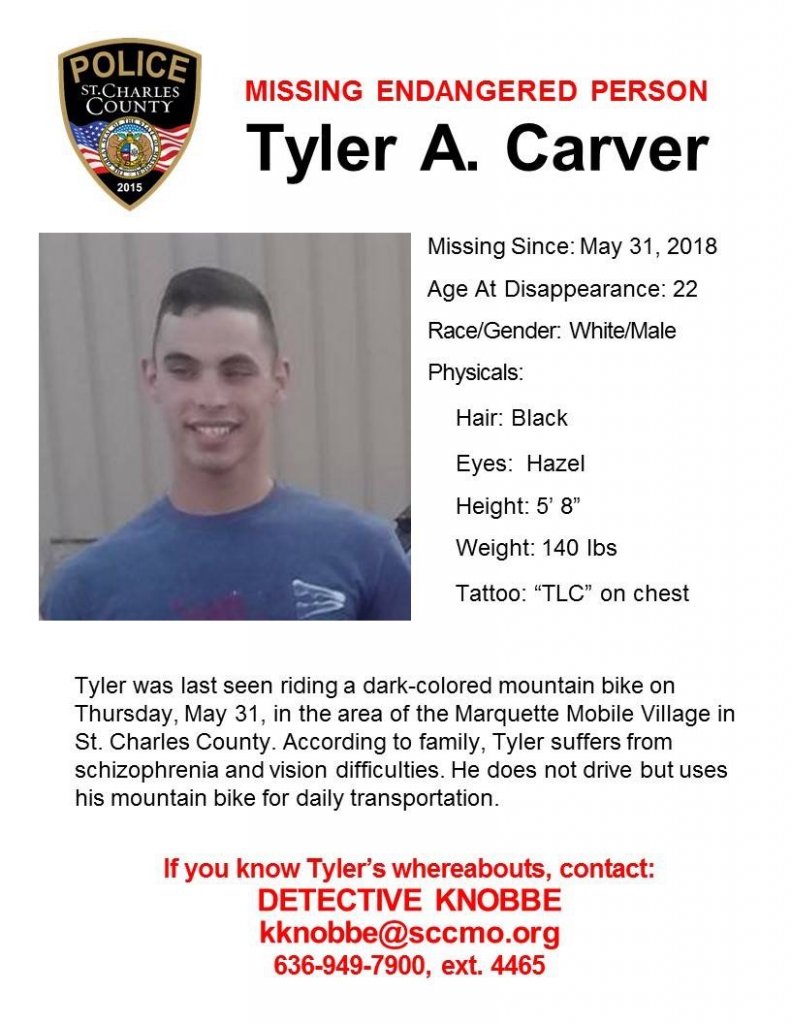 #SCCPDMissing: Today our department issued a Missing Endangered Person Advisory for Tyler A. Carver, 22, of St. Charles County. Tyler was last seen riding a dark-colored mountain bike on Thursday, May 31, in the area of the Marquette Mobile Village in St. Charles County. According to family, Tyler suffers from schizophrenia and vision difficulties. He does not drive but uses his mountain bike for daily transportation.