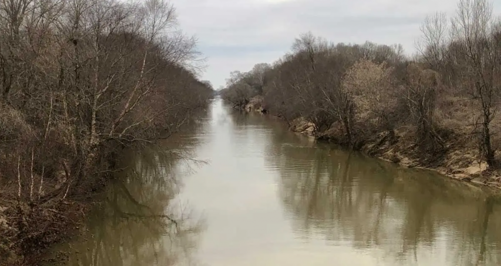 "The long, straight channel of the Tallahatchie River, looking west from the CR 46 bridge, where Jerry Wayne Baggett and Jessica Stacks entered the river. Photo taken Sunday afternoon, January 10, 2021."