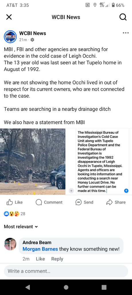 Agents with the FBI, MBI, and other law enforcement agencies were searching a ditch next to the house on Honey Locust Drive, where Leigh Occhi was last seen in August of 1992.