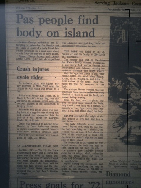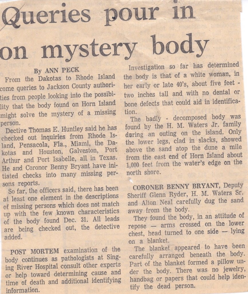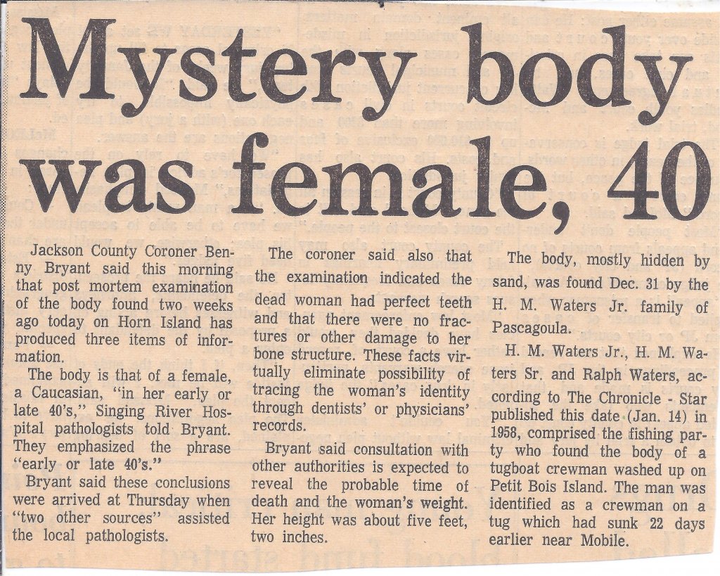 An unidentified body was found on New Year’s Eve about a mile from the east end of Horn Island. The body was buried underneath sand with only the legs from knee to ankle were exposed. A quantity of long light brown hair was found along with a blanket that was underneath the body.