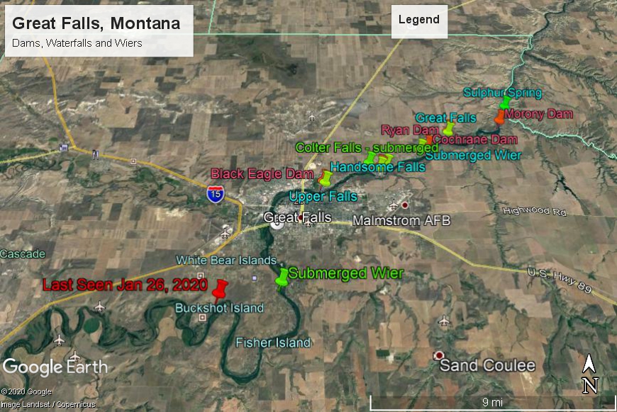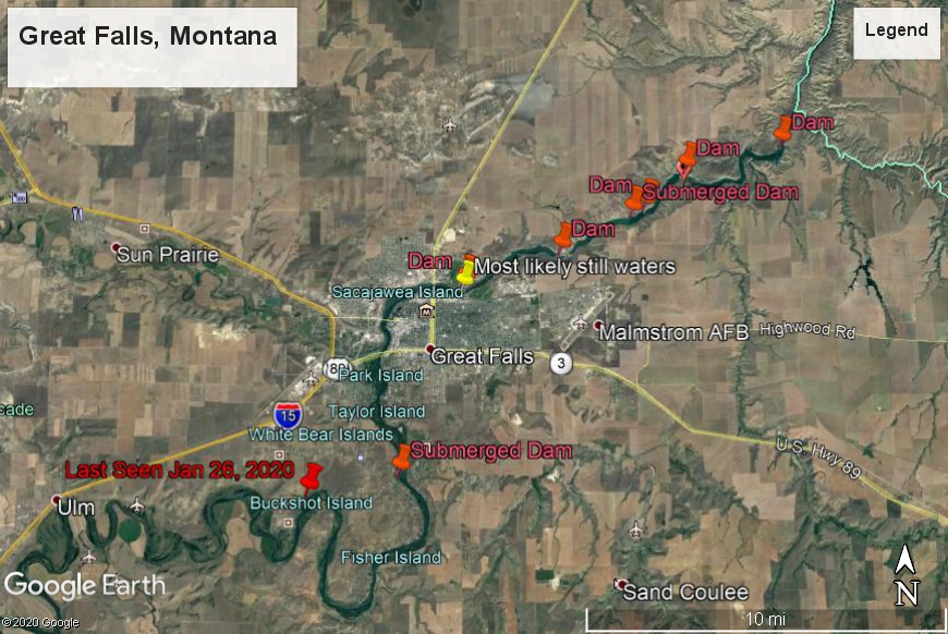 There is over seventeen miles of river between where she was last seen, and the most likely place (of many likely places) that a body would turn up. This the the still water area behind the Black Eagle Dam. Beyond that, there is eight more miles of river and five more dams. There are seven dams total, in Great Falls, all downstream. In theory, a body could pass any of the seven dams, but to pass completely through Great Falls is the least likely scenario. IMO