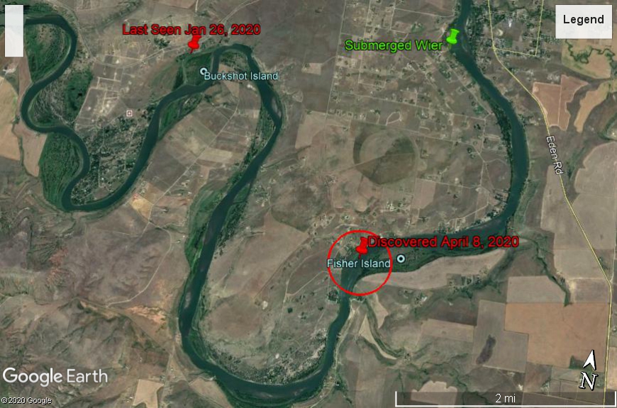 Here is an updated Google Earth aerial shot, showing where Amy was last seen and the general location of the discovery. The distance between them is approximately six river miles.